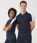 Moisture wicking finish keeps you dry and comfortable.Lightweight and quick drying.Breathable.Flat knit collar.Three self colour button placket.Contrast panels on raglan sleeves.Tear out label.